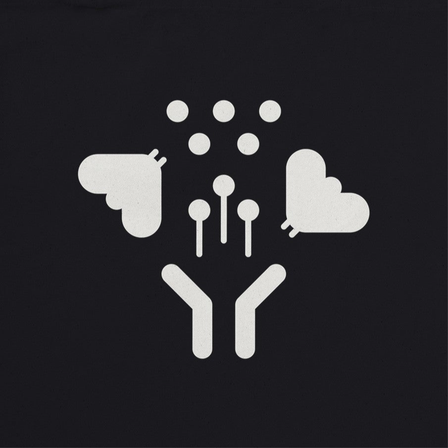 An organic canvas tote celebrating the quiet labor of pollinators. Printed in off-white on deep black — a story you carry with you.